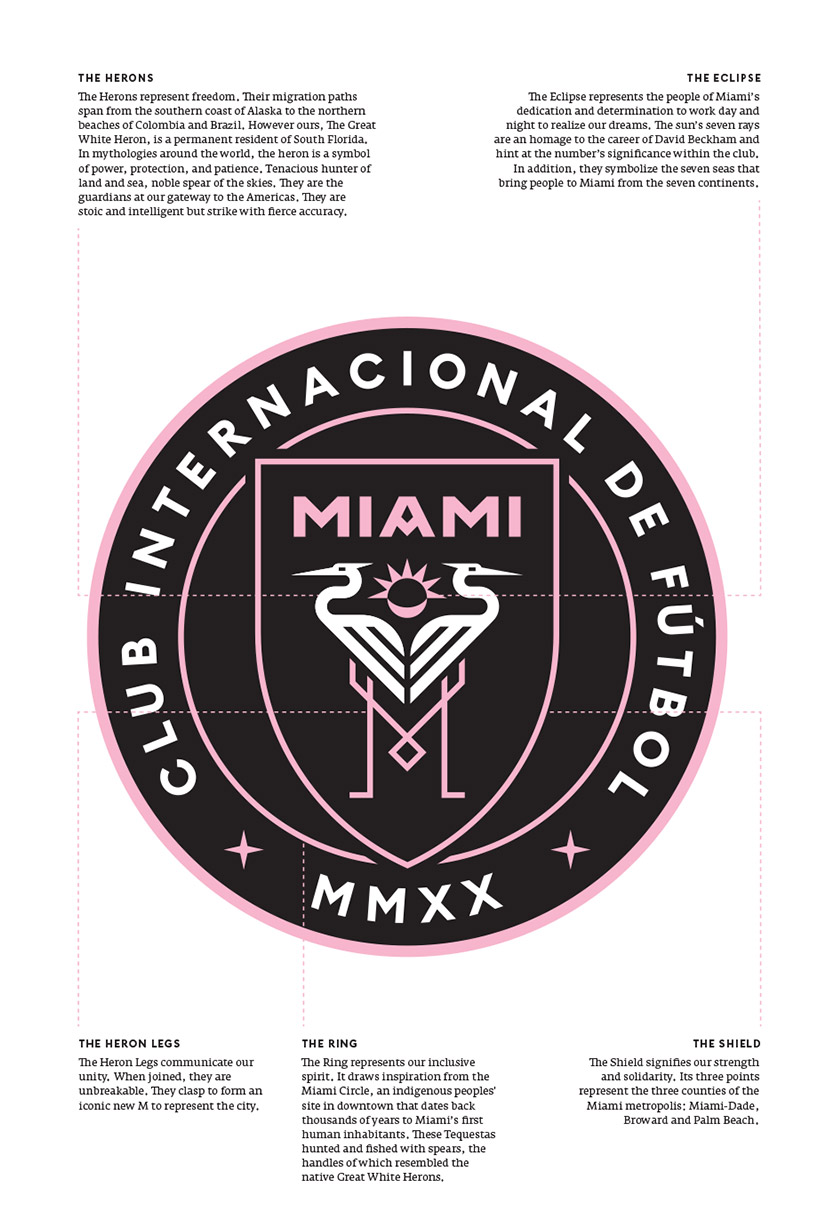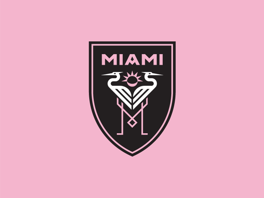 國(guó)際邁阿密的LOGO以黑色和粉色為背景,兩字蒼鷺背靠背站立著,背景是日食。俱樂(lè)部的座右銘是Libertas,Unitas,F(xiàn)ortuna,意思是所有人自由、團(tuán)結(jié)包容和好運(yùn)的概念。