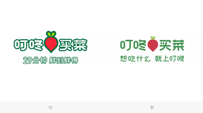 去掉輪廓描邊后,紅蘿卜顯得更加圓潤(rùn)肥碩,兩片綠色的蘿卜纓連接在一起,形成一個(gè)綠色的心形符號(hào)。品牌口號(hào)也從之前的「29分鐘鮮到鮮得」變更為「想吃什么 就上叮咚」。個(gè)人理解的是,前者強(qiáng)調(diào)高效率的便利購(gòu)物體驗(yàn),后者則囊括了生鮮美食等滿足各類(lèi)家庭生活所需的產(chǎn)品。