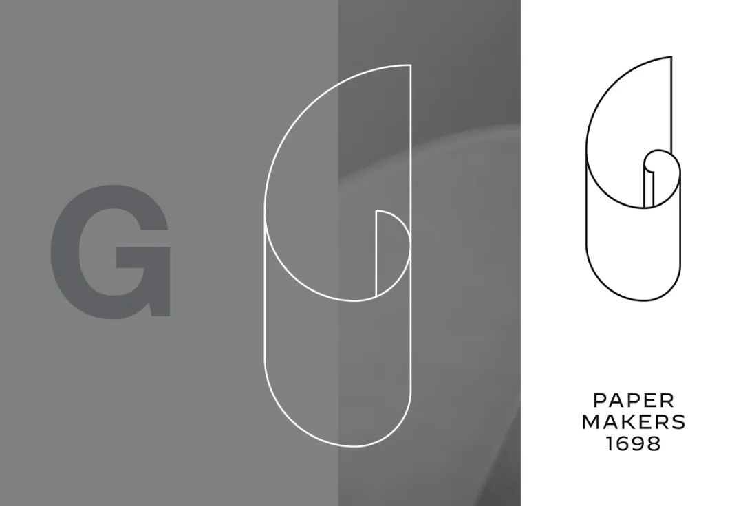 結(jié)合了紙張卷起來的打包方式以及黃金比例,一個波浪形的G字符號就此誕生。然后在圖形的下方添加上「Paper Makers 1698」字樣,以強調(diào)其悠久的品牌歷史。