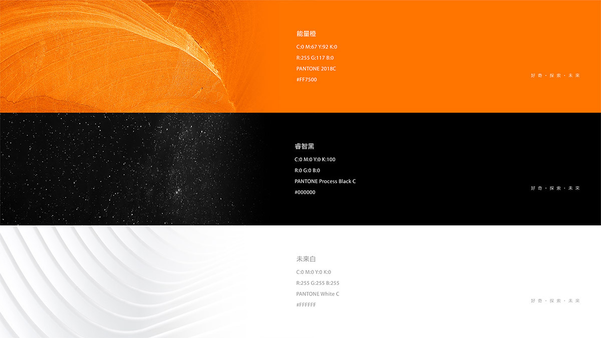 升級后品牌主色調(diào)繼承原有的橙色系,并提升色彩亮度,增添更多活力與能量。主色調(diào)“能量橙”,搭配“睿智黑”和“未來白”兩種輔助色彩,三者和諧搭配,共同構(gòu)成了圖拉斯品牌色彩系統(tǒng),同時(shí)也對應(yīng)展現(xiàn)品牌理念“好奇、探索、未來”。